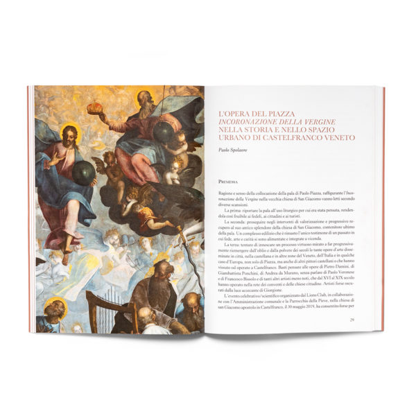 Paolo Spolaore ricostruisce in dettaglio gli spostamenti del dipinto tra chiese e conventi soppressi o demoliti e contese tra enti cittadini. Una ricerca che illumina anche la scena del patrimonio artistico della città e dei suoi radicali mutamenti nei secoli. Giorgio Tagliaferro getta nuova luce su Paolo Piazza, alias Fra Cosmo da Castelfranco. Non un cappuccino pittore, che operava solo a servizio del suo Ordine, ma un pittore veneziano di buona scuola, diventato poi cappuccino, che operò in molte corti italiane ed europee. Paolo Asolan descrive e illustra con profondità e maestria gli aspetti simbolico devozionali del dipinto e più in generale i criteri di lettura delle opere d’arte a carattere religioso.