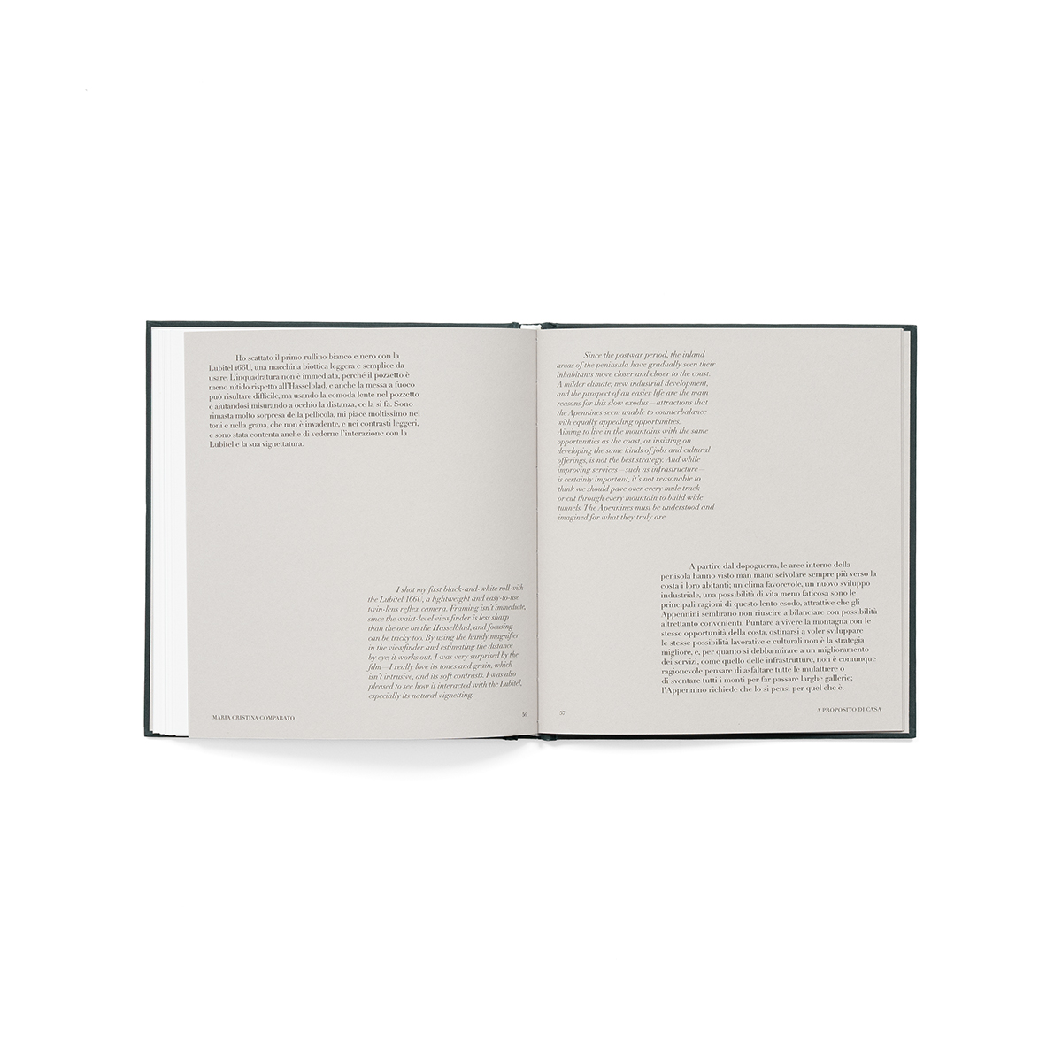 A proposito di casa revisits the archive of Apulian photographer Cristina Comparato, tracing her gaze and lines of inquiry. The volume presents a selection of analog images—both black-and-white and color—that engage with the central themes of her research and wanderings: the landscape, small towns, her native coastline, and the beloved Apennines. In the years preceding her untimely death, Comparato experimented tirelessly with film and a range of formats, favoring the Hasselblad, while reflecting on the relationship between memory and the perception of place, as well as on the very meaning of “home.” What emerges is a disenchanted, almost literary, and deeply empathetic perspective, turned toward an Italy that struggles to align with the semantics of progress: frank, melancholic, rugged yet generous, composed of open horizons, uncultivated lands, fragments of places, and poetic glimpses.The volume is enriched by excerpts from her diaries and by a poem dedicated to the ferula, a cherished flower.