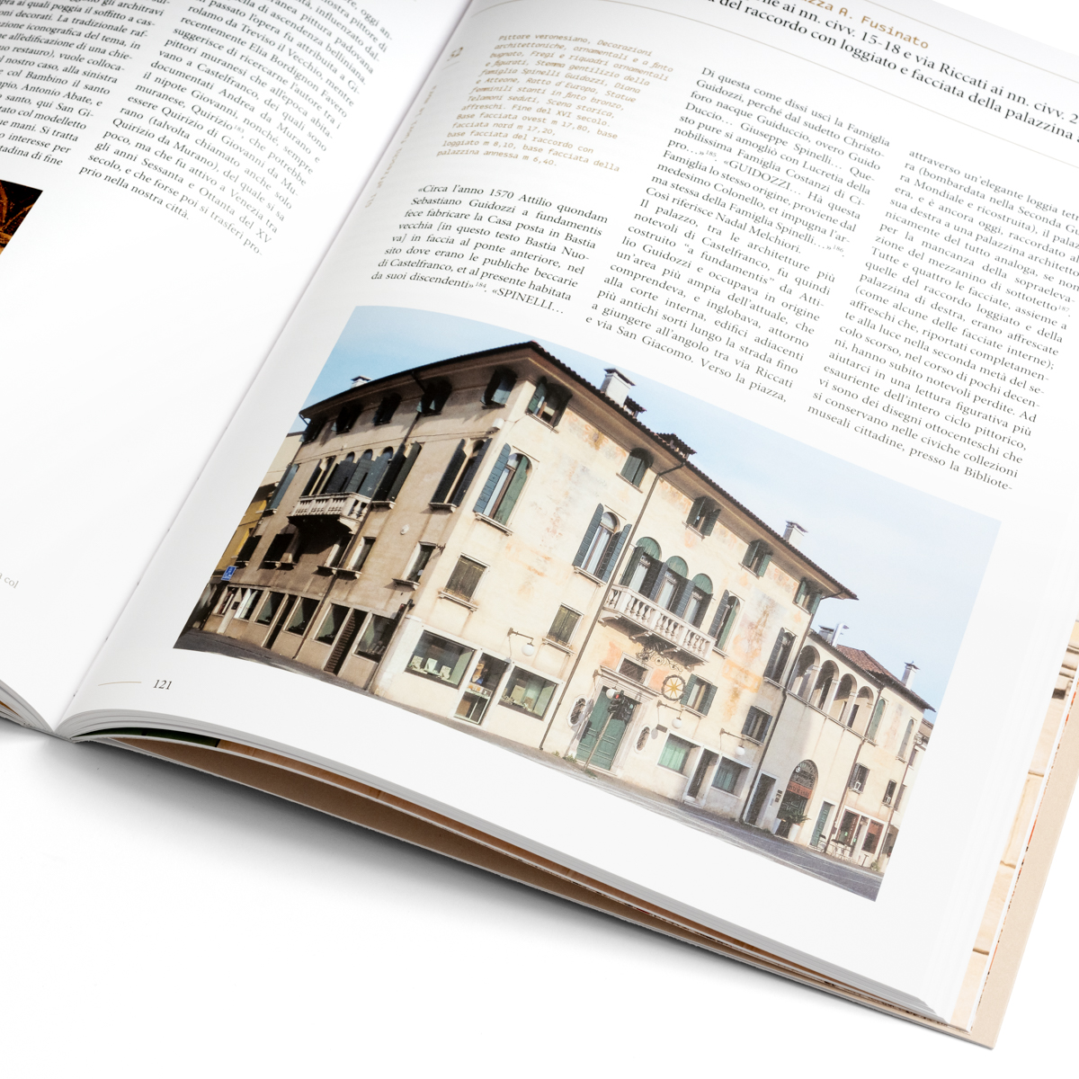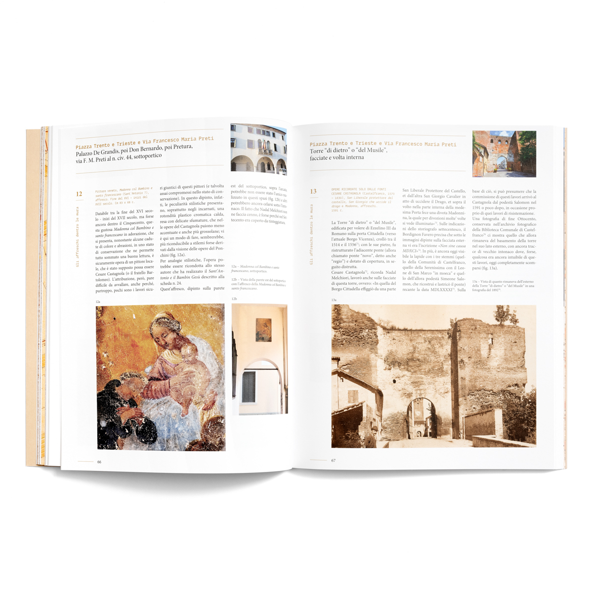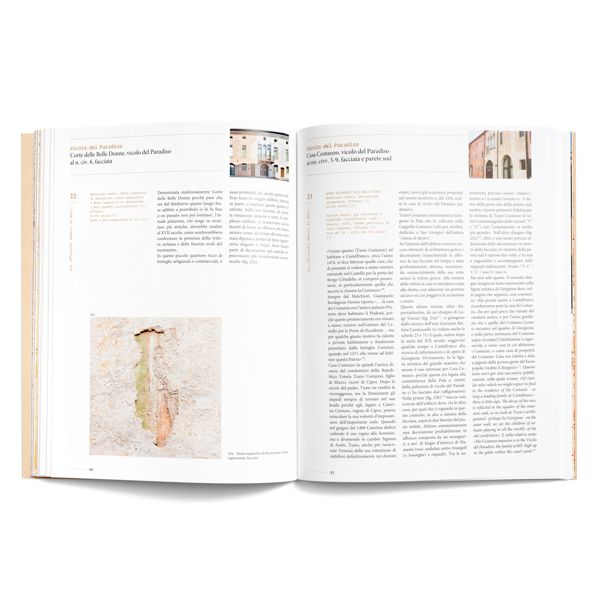 Castelfranco Veneto. Affreschi di facciata nella città di Giorgione è un libro che mancava: per la prima volta, infatti, un intero volume è completamente dedicato alle pitture esterne del centro storico della città. Sono trattate in maniera approfondita, in più di 80 schede, con relative fotografie, oltre 100 opere realizzate singolarmente o in elaborati cicli in affresco, da maestranze locali e “foreste”. Opere tutt’ora esistenti, scomparse o che ancora forse si conservano celate da intonaci successivi, ognuna rivisitata, “ricostruita” o rintracciata sulla base di fonti antiche e meno antiche, a partire dagli insostituibili scritti dell’erudito settecentesco della città, Nadal Melchiori.
