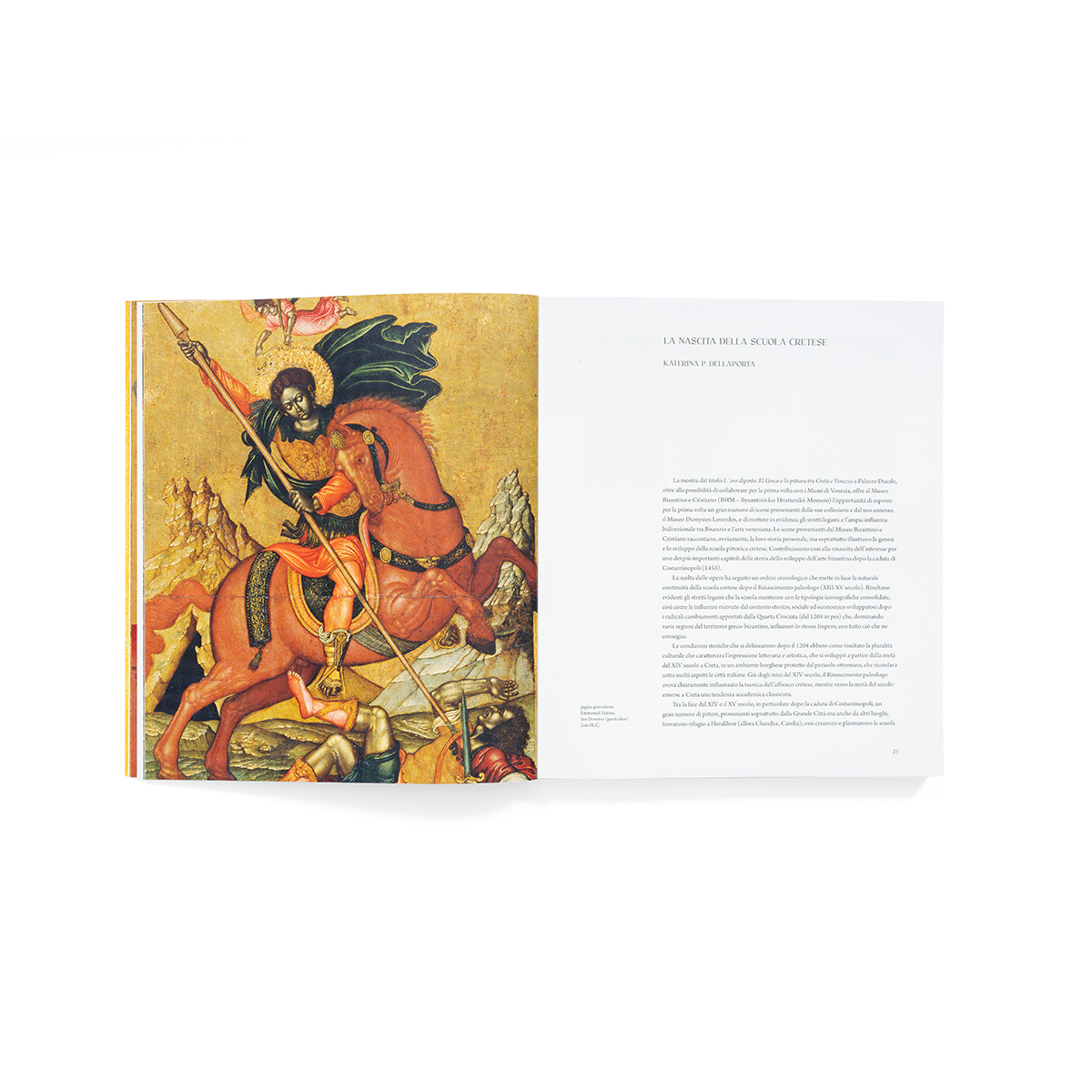 L’esposizione L’oro dipinto. El Greco e la pittura tra Creta e Venezia offre ai visitatori e agli studiosi una rara opportunità per ammirare eccezionali icone e dipinti bizantini che provengono da alcune delle più importanti collezioni e musei del mondo. Il catalogo della mostra focalizza storicamente e stilisticamente una “scuola” pittorica che, con le sue originalissime peculiarità ha rappresentato un solido ponte culturale tra le nazioni italiana e greca. In particolare tra l’isola di Creta – ovvero la Candia perla dello “Stato da Mar” della Serenissima – e la madre-patria Venezia: quasi quattro secoli di continuo vivace scambio, sia di manufatti pittorici, sia di vera immigrazione, temporanea, ma talvolta anche permanente di artisti “iconografi” attivi in laguna; specie dopo la definitiva caduta in mano ottomana dell’isola di Candia nel 1669. Il risultato fu l’originalissimo incontro e sintesi della nativa impronta bizantina (in verità già una delle anime fondanti della stessa civiltà di Venezia) con il linguaggio figurativo occidentale, specie proprio quello dell’aureo Rinascimento veneto fra Quattro e Cinquecento; e, al centro, il campione fuoriclasse di Domenikos Theotokopoulos – il grande El Greco – anch’egli veneziano d’adozione negli anni cruciali della formazione prima della maturità artistica, accanto ai “giganti” della pittura veneta cinquecentesca.