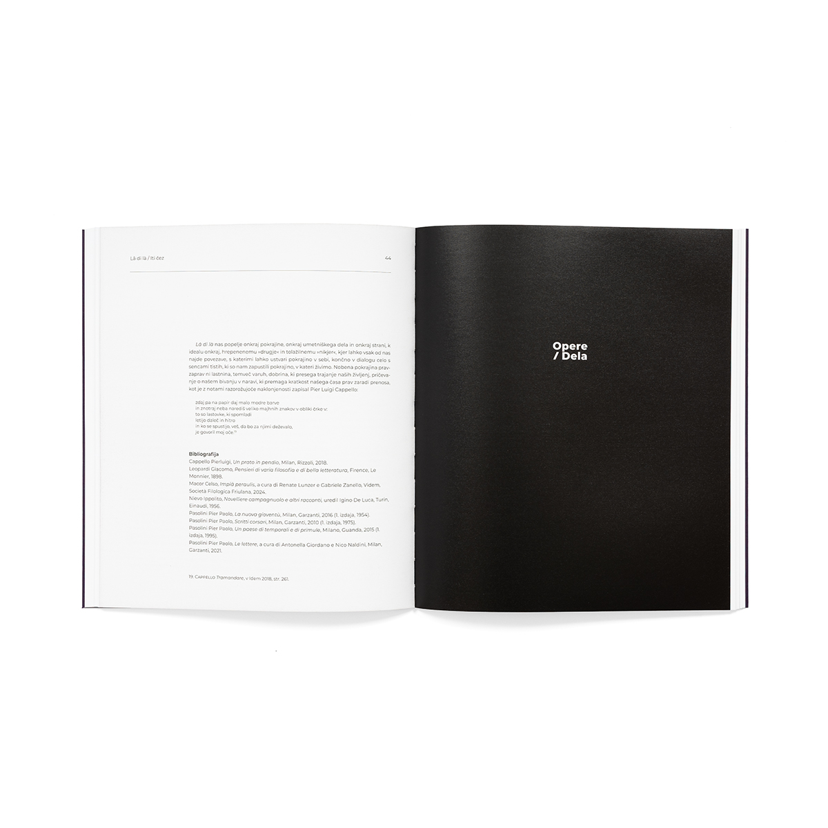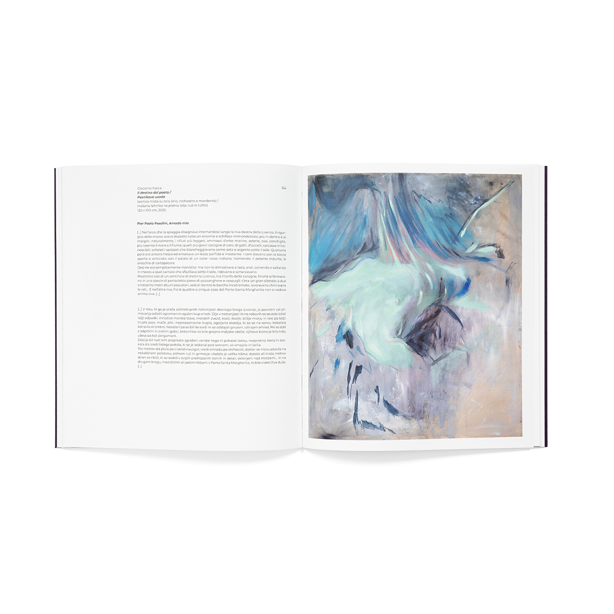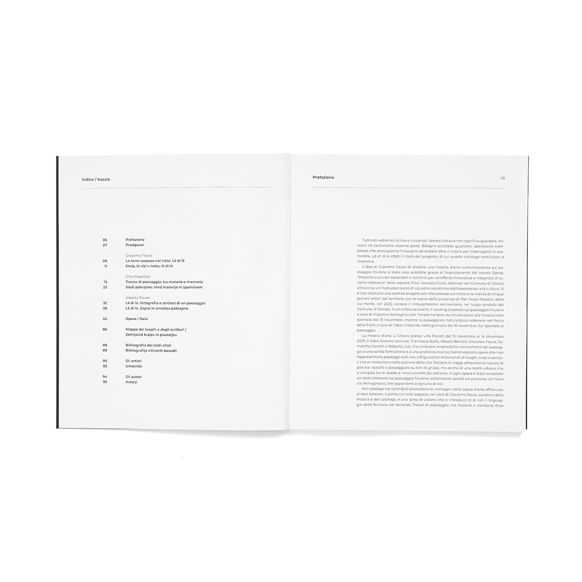 Lâ di là (in lingua friulana letteralmente “andare oltre”) non è solo un titolo del progetto, di cui questo catalogo costituisce la memoria, ma esprime una visione del mondo di cui le arti figurative e la letteratura si presentano come manifesto e come strumento di benefico contagio. L’omonima mostra d’arte contemporanea sul paesaggio friulano, ospitata dal comune di Chions è stata l’evento centrale, e ha connesso la ricerca di cinque giovani artisti del territorio con le tracce della presenza di Pier Paolo Pasolini, della cui morte, nel 2025, correva il cinquantesimo anniversario, nel luogo simbolo del Comune, le Torrate. Il volume, rispecchiando la scelta del percorso espositivo, alterna opere e testi letterari sul paesaggio friulano, sollecitando un percorso, sia fisico sia immaginario, che appartiene a ognuno di noi. Dalla parola alla materia e viceversa, tale da invitare il lettore – e il visitatore – al recupero di un paesaggio interiore, trovando da sé la chiave della corrispondenza e scoprendo spesso che quella immaginata dell’artista differisce dalla sua. I passi scelti compongono un’antologia di scrittori friulani del Dopoguerra, periodo in cui interviene un cambiamento di rotta che porta ad alterare e a omologare la «semplicità primitiva» di questa terra. Già violata dalle guerre, vive un cambiamento della società, che, in termini pasoliniani, è sempre più “sviluppo” che “progresso”.