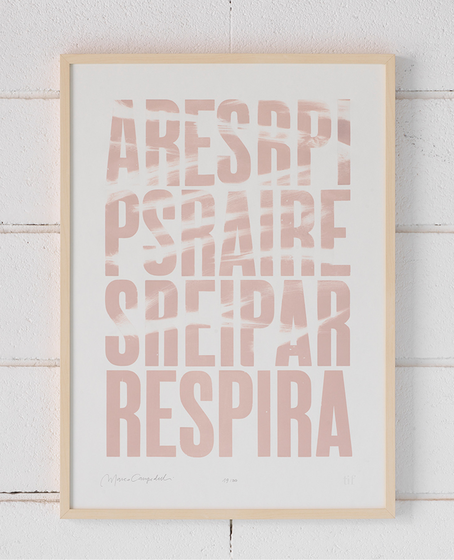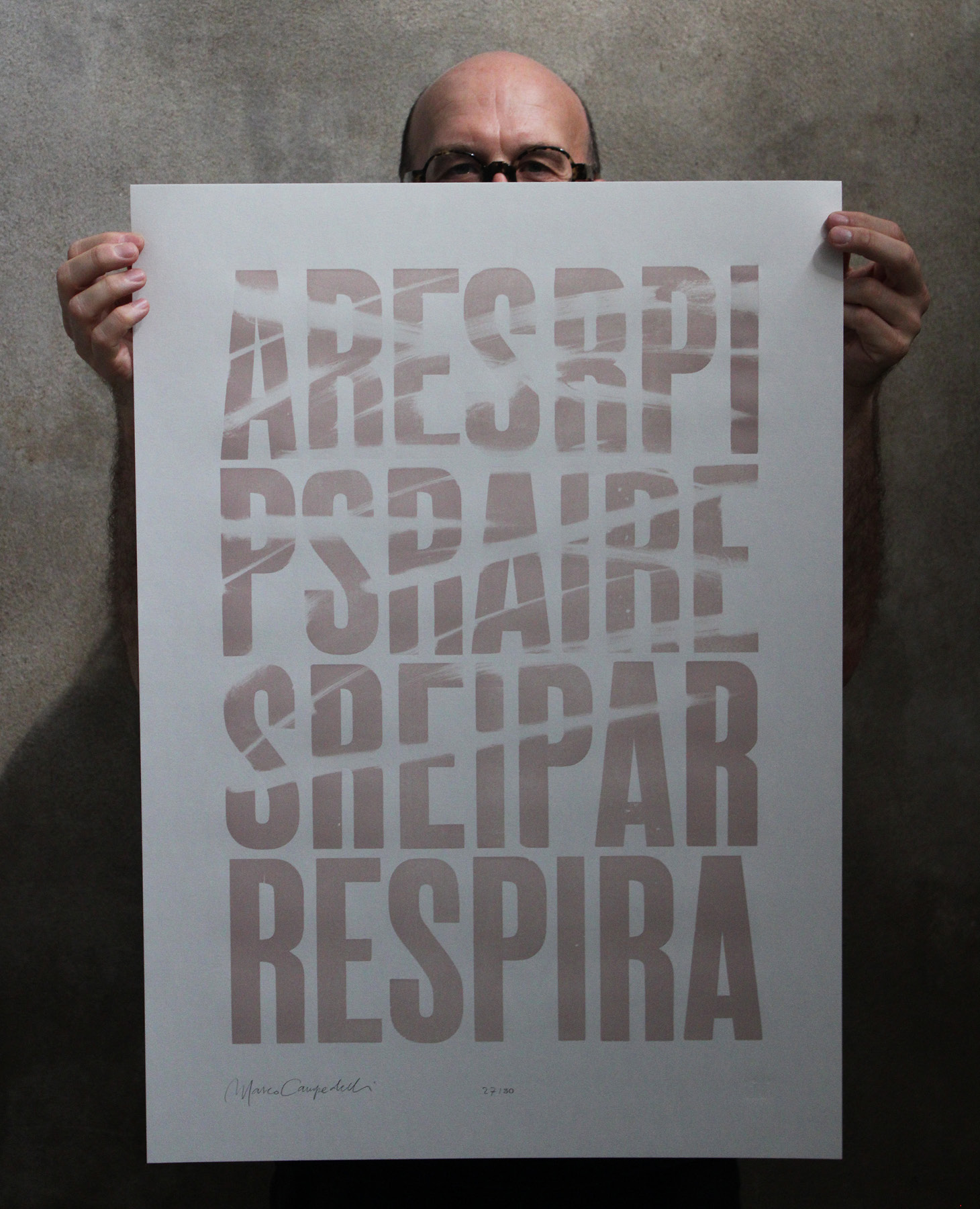 Respira gioca sul valore di tale atto: il soffio vitale dell’aria ricompone il benessere, ricreando il cosmo (cioè l’ordine) e facendo fluire ogni cosa in noi. Respirare manifesta la nostra stessa essenza e, come ha scritto Vito Mancuso, «Respiro, dunque sono». La forza del manifesto è racchiusa nella ricomposizione di un semplice verbo nel modo imperativo: «Respira».