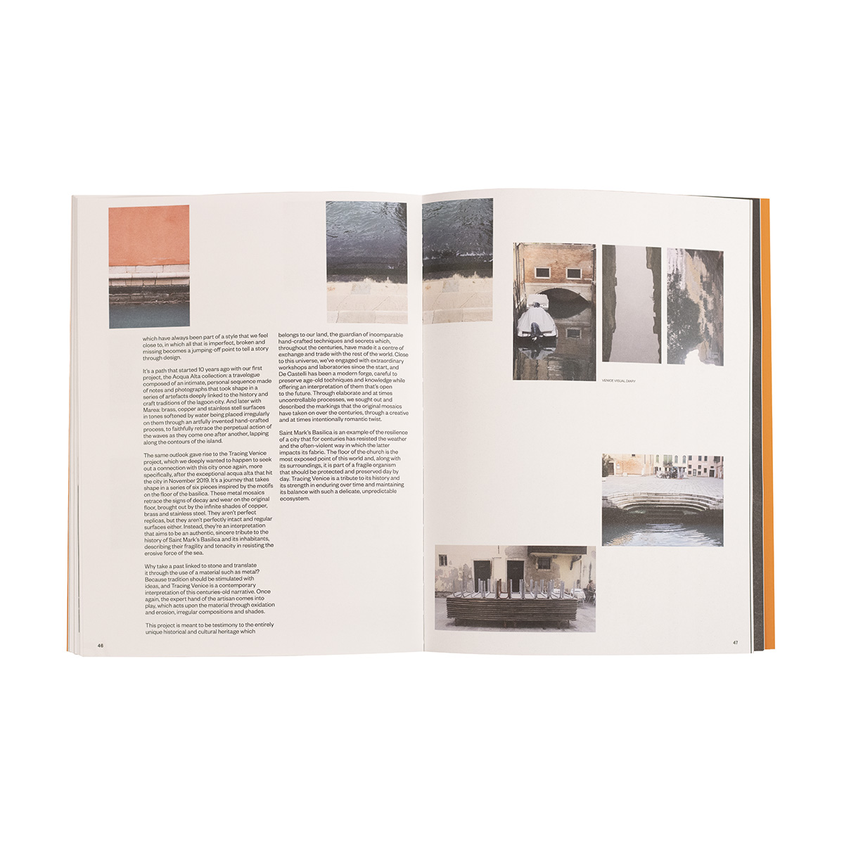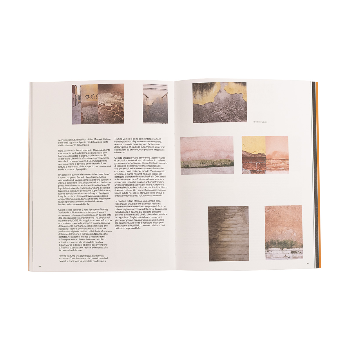 Tracing Venice segue la ricerca di Zanellato/Bortotto, esposta a Homo Faber 2022 (Venezia) ed è un omaggio ai pavimenti musivi della Basilica di San Marco che De Castelli traduce in preziosi masaici di diversi metalli.