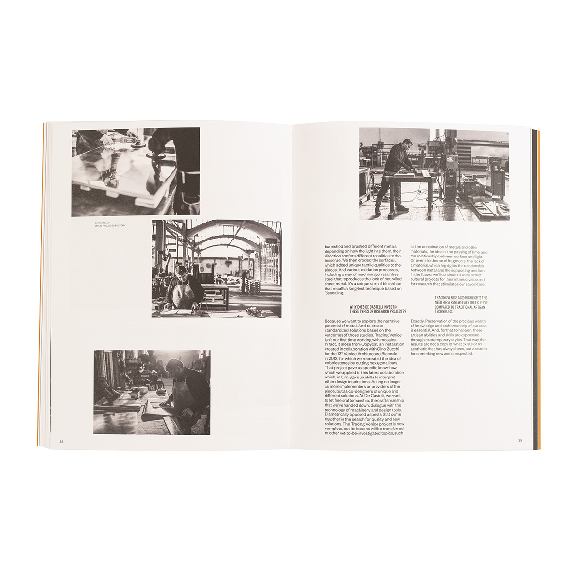 Le lavorazioni inimitabili e le originali tecniche manuali messe a punto dall’azienda trevigiana, attraverso un continuo impegno di ricerca e sviluppo, sono diventate le protagoniste di un progetto nato dall’incontro tra il percorso imprenditoriale di De Castelli e quello dei designer Giorgia Zanellato e Daniele Bortotto: da questa affinità di visioni sono nate superfici uniche, che sorprendono per la loro magia realizzativa e parlano di una storia millenaria.